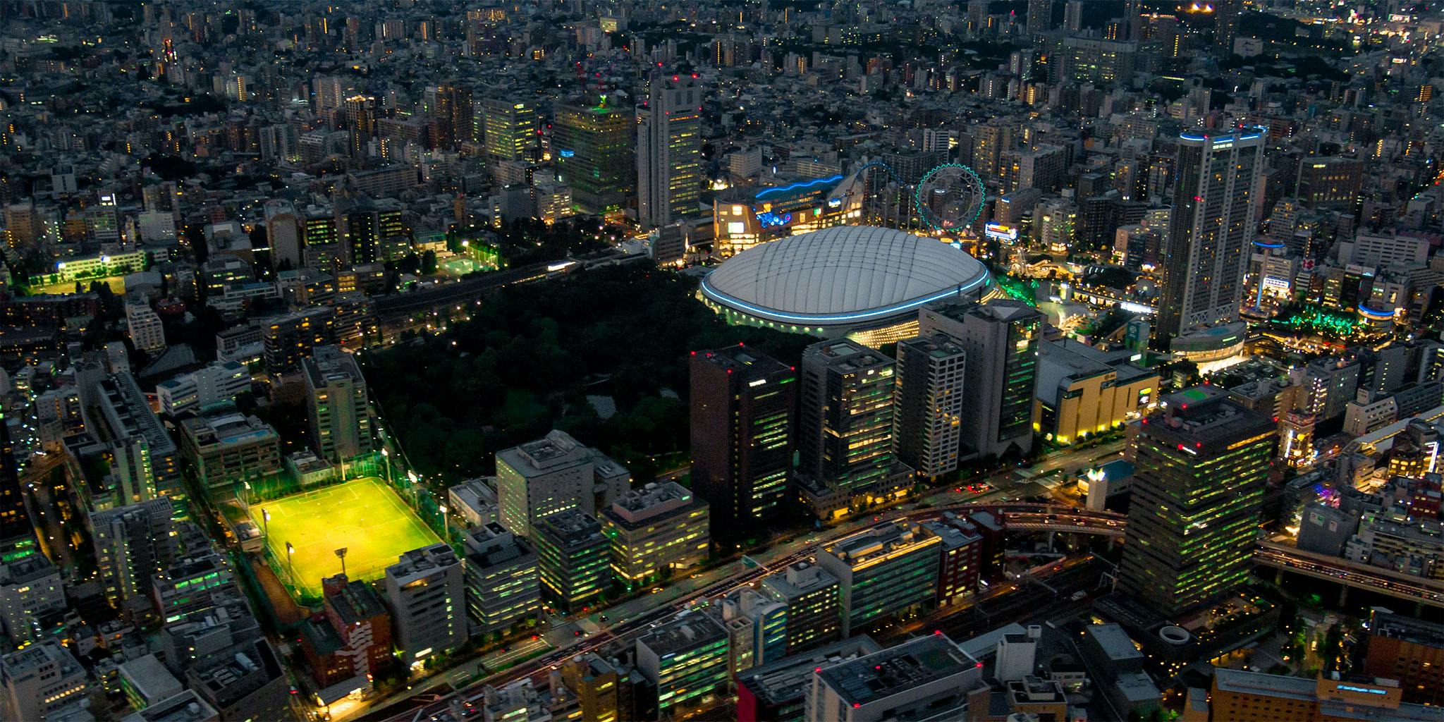 城市灯光直升机巡游:东京中心和横滨
